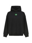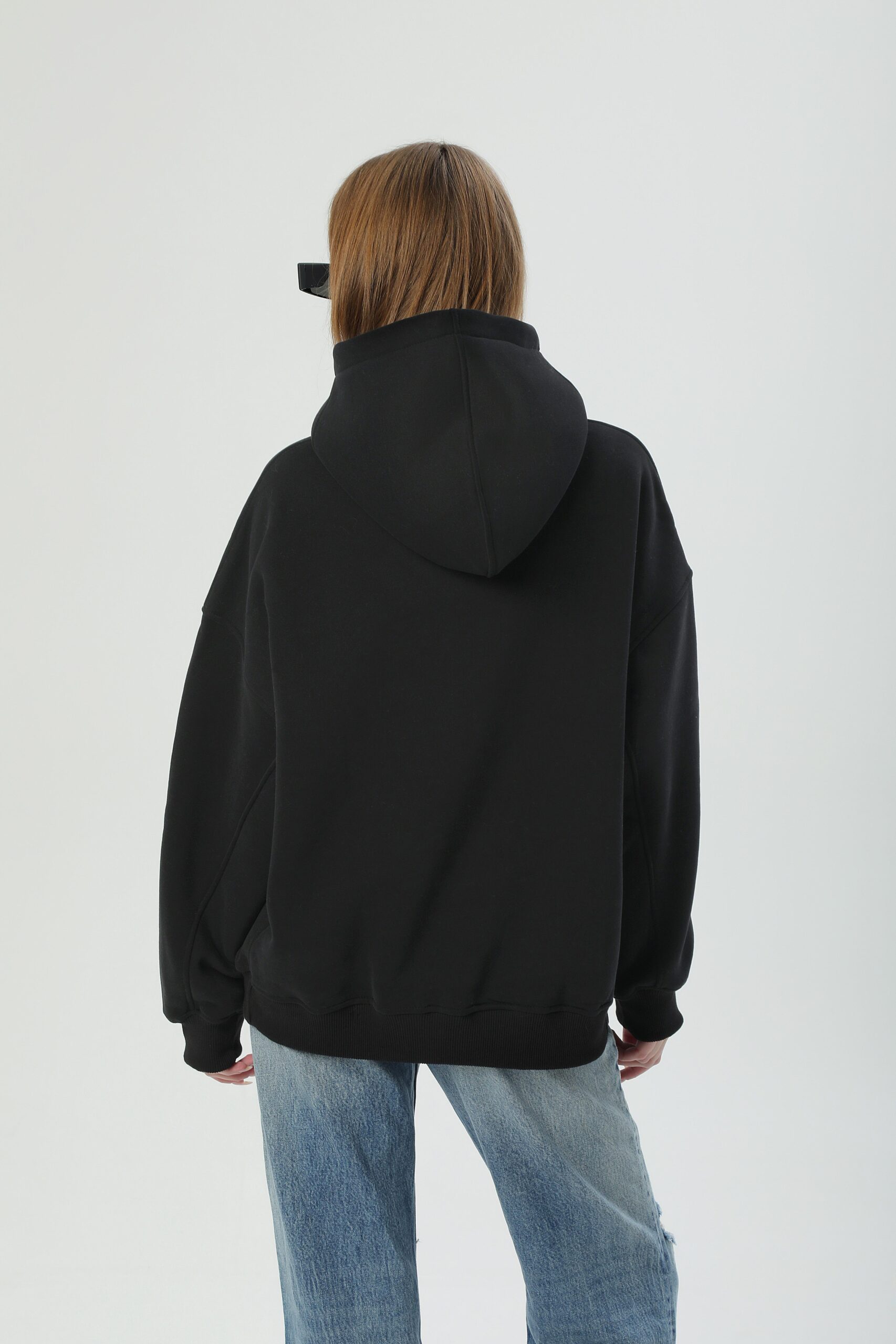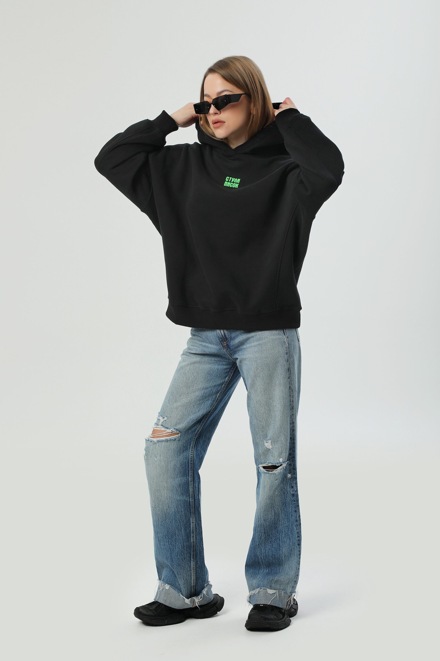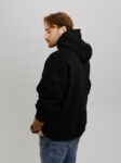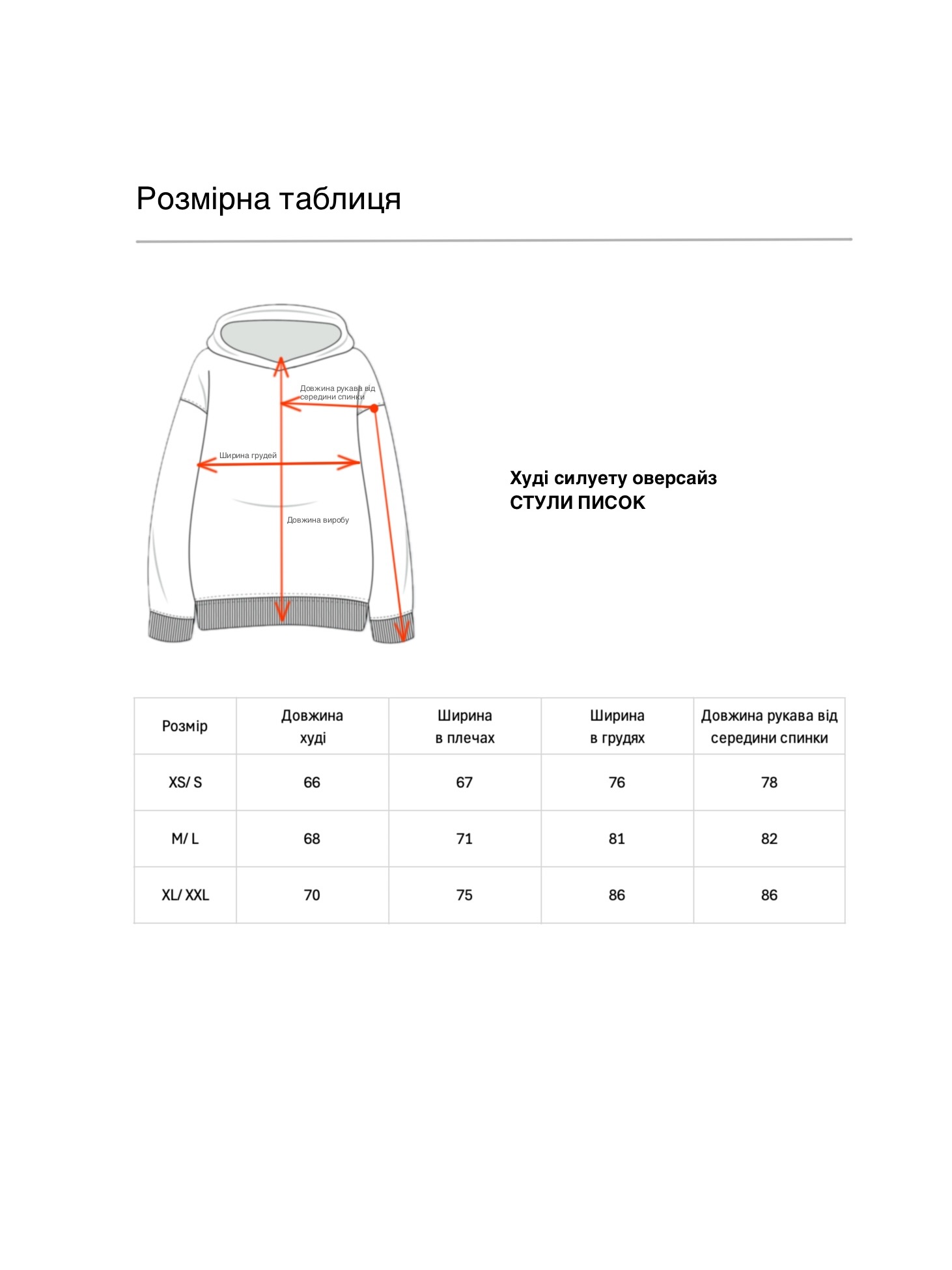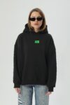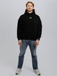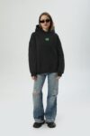 Худі унісекс силуету оверсайз. Виготовлене з важкої фактурної утепленої бавовни з начісом. Тканина має ефект персикової шкірки – ніжну оксамитову поверхня, яка дарує приємні відчуття. Конструкція включає додатковий обʼєм для тіла та рукавів, щоб створити округлу та розслаблену форму в образі. Техніка нанесення принта флок – це прорезинений матеріал із оксамитовою поверхнею. Завдяки високим тискам наноситься на тканину і є практично вічним.