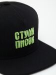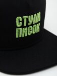 Пʼятипанельний снепбек із рівним козирьком в чорному кольорі із обʼємною вишивкою «стули писок» спереду. Виконаний в поєднанні 100% акрилу та нейлонової сітки в затилочній частині кепки. Легко регулюється розмір за допомогою пластикового фіксатора.